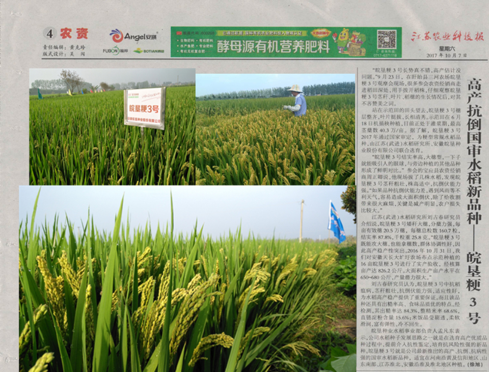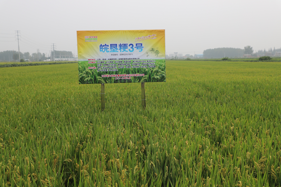 【品種主要性狀】:粳型常規(guī)水稻品種。黃淮粳稻區(qū)種植全生育期平均156.9天,比對(duì)照徐稻3號(hào)晚熟1.4天。株高95.5厘米,穗長(zhǎng)15.6厘米,每畝有效穗數(shù)20.5萬(wàn),每穗總粒數(shù)160.7粒,結(jié)實(shí)率87.8%,千粒重25.8克??剐裕旱疚敛【C合指數(shù)兩年分別為4.0和3.7,穗頸瘟損失率最高級(jí)3級(jí),條紋葉枯病最高級(jí)5級(jí),中抗稻瘟,中感條紋葉枯病。主要米質(zhì)指標(biāo):整精米率68.6%,堊白粒率29%,堊白度5.9%,直鏈淀粉含量15.6%,膠稠度65 mm。