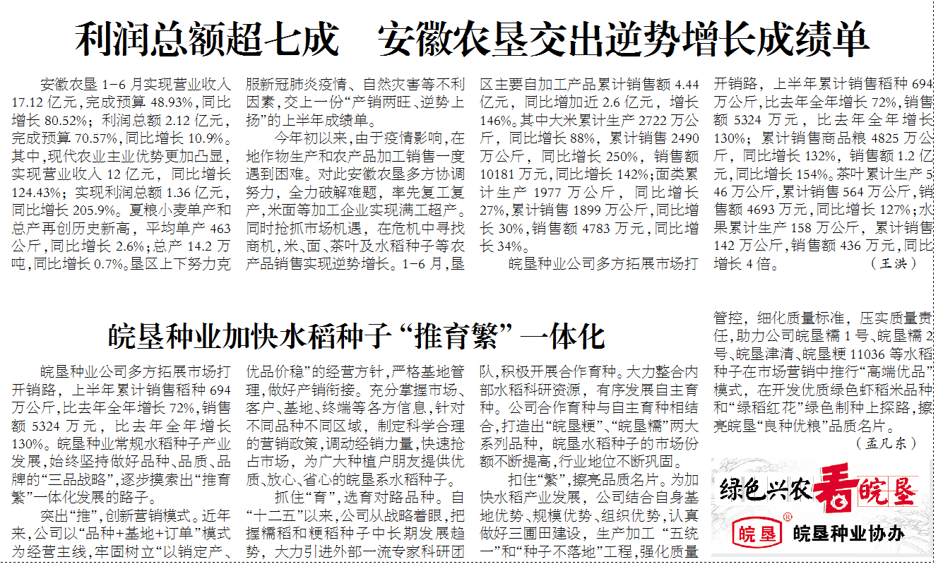 皖墾種業(yè)在安徽日?qǐng)?bào)農(nóng)村版農(nóng)業(yè)周刊開(kāi)辟“綠色興農(nóng)看皖墾”專欄