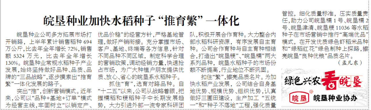 皖墾種業(yè)公司多方拓展市場(chǎng)打開銷路,上半年累計(jì)銷售稻種694萬公斤,比去年全年增長72%,銷售額5324萬元,比去年全年增長130%。皖墾種業(yè)常規(guī)水稻種子產(chǎn)業(yè)發(fā)展,始終堅(jiān)持做好品種、品質(zhì)、品牌的“三品戰(zhàn)略”,逐步摸索出“推育繁”一體化發(fā)展的路子。