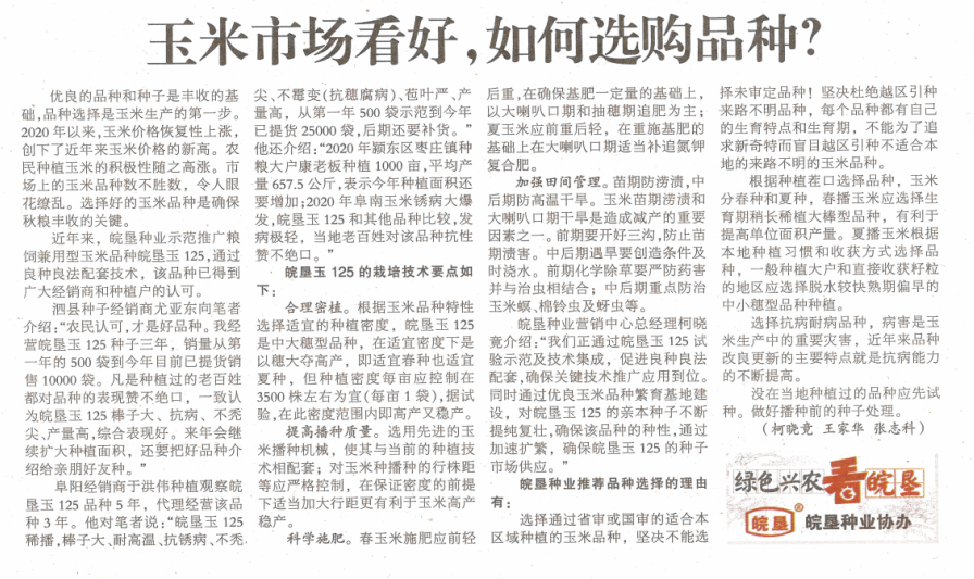 近年來,皖墾種業(yè)示范推廣糧飼兼用型玉米品種皖墾玉125,通過良種良法配套技術(shù),該品種已得到廣大經(jīng)銷商和種植戶的認(rèn)可。